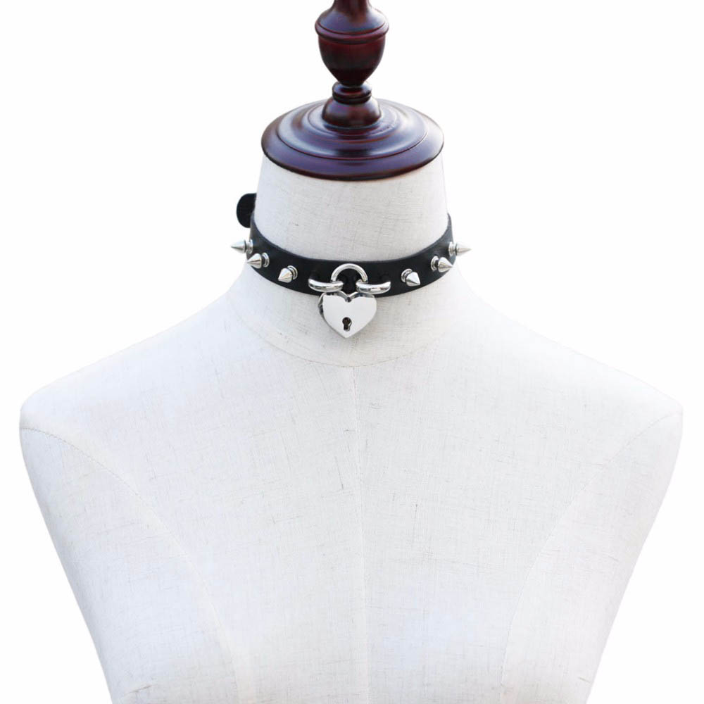 ボンデージ風 スパイクハート南京錠 フェイクレザーチョーカー 首飾り ネックレス レディース 黒色 赤色 白色 ホワイト ブラック レッド SM風 ゴシック パンク 首に巻く ベルト タイト フィット モデル コスプレ 仮装 オモシロ ラリエット風 カギ 鍵 ボンテージ ロック