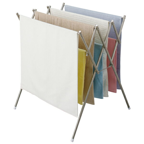 コンパクトに収納可能! オールステンレス製でさびに強い!!●商品サイズ(約):幅42〜69.5×奥行65×高さ77cm ●収納時サイズ(約):幅42×奥行9.5×高さ86.5cm ●重量:1.43kg ●耐荷重:全体で3kg ●干せる量の目安:バスタオル4枚、タオル6枚 ●材質:ステンレス、ポリプロピレン、塩化ビニル樹脂、ABS樹脂★