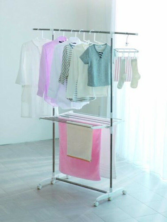 上下段の洗濯物が重なりにくく、大判のバスタオル(70×140cm)も床に付かないゆとり設計!洗濯物の長さに合わせて竿の高さを変えられる。