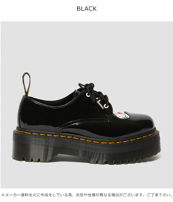 こちらのシューズはQUADソールの1461 3ホールシューズ、ブラックの光沢のあるパテントレザーでつくられており、デザインは左右に非対称のハローキティのハートデザインを備え、ロゴ入りのダブルタグとメタルチップレースが特徴です。