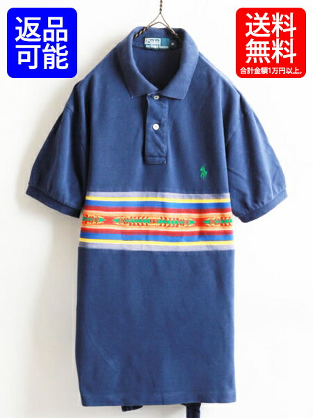■POLO ポロ ラルフローレン ネイティブ ボーダー切替 鹿の子 半袖 ポロシャツ( メンズ 男性 M )紺 ネイビー ラルフ ポニー刺繍 古着