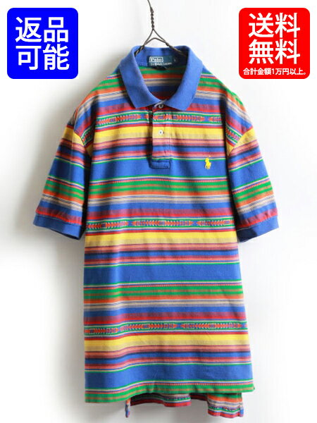■POLO ポロ ラルフローレン マルチカラー ネイティブ ボーダー柄 コットン 半袖 ポロシャツ( 男性メンズ L )ラルフ ポニー刺繍 古着