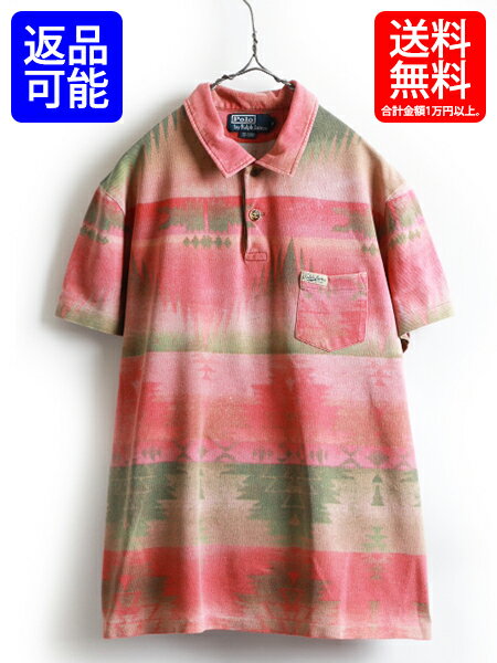 ■POLO ポロ ラルフローレン 鹿の子 ネイティブ柄 ポケット付き 半袖 ポロシャツ( 男性 メンズ XL )半袖ポロシャツ ナバホ 柄シャツ 古着