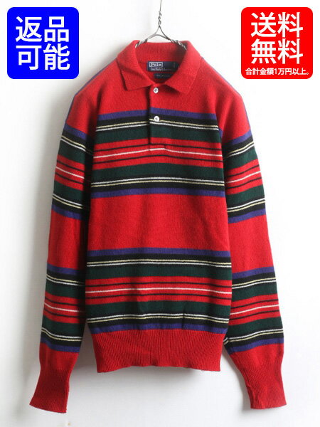 90's オールド ■ POLO Ralph Lauren ポロ ラルフローレン マルチ ボーダー 長袖 ウール ニット ポロシャツ ( メンズ 男性 L ) 古着 襟付き| 【US古着】【古着】中古 古着 長袖ニット ウールニット ニットポロ トップス プルオーバー ネイティブボーダー 長袖ポロ