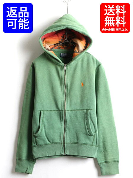 希少 S ■ POLO ラルフローレン フルジップ スウェット フード パーカー ネイティブ 柄 ライナー ( 男性 メンズ ) トレーナー スエット 緑| 【US古着】古着 中古 ポロ RALPH LAUREN ラルフ 裏起毛 スウェットパーカー フーディー フードパーカー ワンポイント ポニー 刺繍