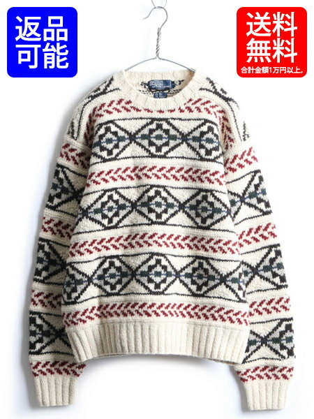 90's 手編み 大きいサイズ XL ■ POLO ポロ ラルフローレン ネイティブ 柄 ハンドニット 長袖 ウール ニット セーター (男性 メンズ ) 古着| 【US古着】中古 90年代 RALPH LAUREN 長袖セーター 長袖ニット ノルディック 生成り 総柄 ネイティブ柄 ハンドメイド クルーネック