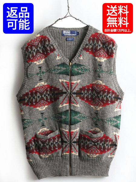 90's ■ POLO ポロ ラルフローレン ネイティブ フルジップ アルパカ x ラム ウール ニット ベスト ( 男性 メンズ L ) 古着 グレー 総柄| 【USA古着】 中古 ウールベスト ニットベスト RALPH LAUREN 重ね着 トップス ジレ ポケット付き ネイティブ柄 ウールニット